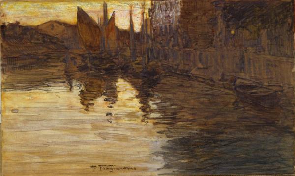 Dipinto a tempera di piccole dimensioni di Pietro Fragiacomo, montato in cornice insieme ad altre due vedute (Inverno, Pace), raffigurante una veduta di Venezia, con un canale e alcune barche al tramonto.