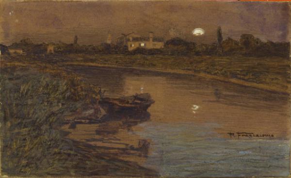 Dipinto a tempera di piccole dimensioni di Pietro Fragiacomo, montato in cornice insieme ad altre due vedute (La campana della sera, Inverno), raffigurante una veduta di campagna con un corso d'acqua in primo piano, di notte.