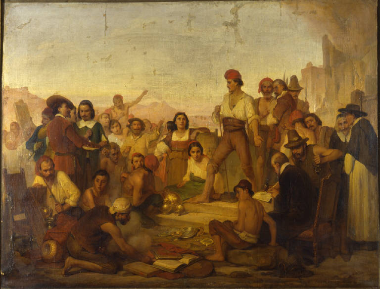 Dipinto a olio di medie dimensioni di Giuseppe Mazza, raffigurante un gruppo di popolani napoletani del XVII secolo, raccolti attorno a Masaniello, in piedi al centro.