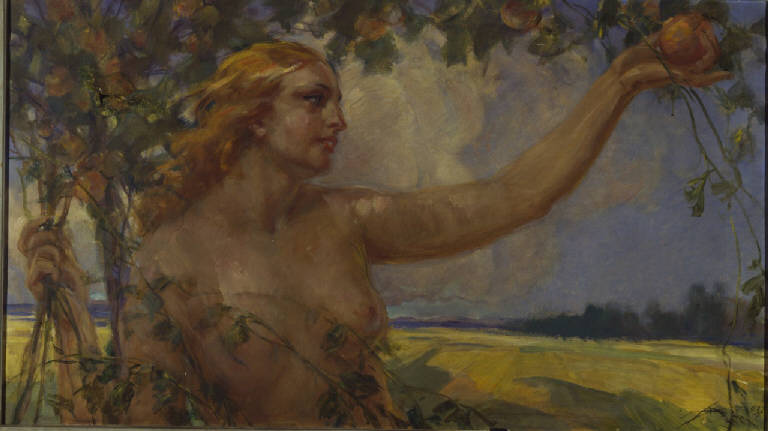 Dipinto a olio di medie dimensioni di Aldo Mazza, raffigurante una donna bionda a mezzobusto, forse la moglie del pittore, nuda, che tende il braccio sinistro per prendere un frutto dal ramo di un albero.