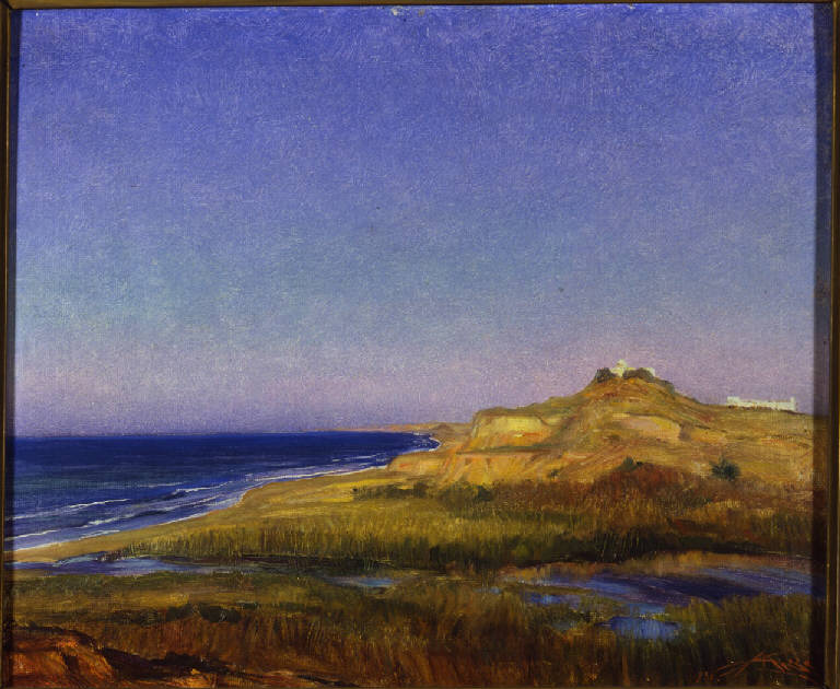 Dipinto a olio di medie dimensioni di Aldo Mazza, raffigurante un paesaggio marino, con un monte sulla destra e il mare sulla sinistra.
