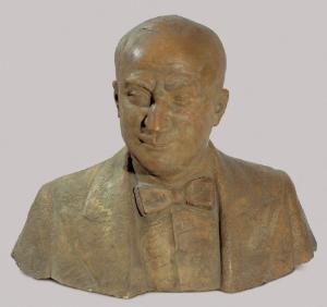 Busto in terracotta di dimensioni naturali di Timo Bortolotti, raffigurante Guido Rossi con giacca e cravatta a farfalla.