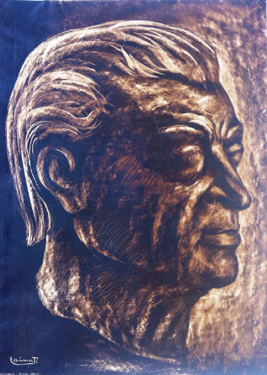 Disegno a china riproducente la testa in bronzo di Francesco Mauro di tre quarti.