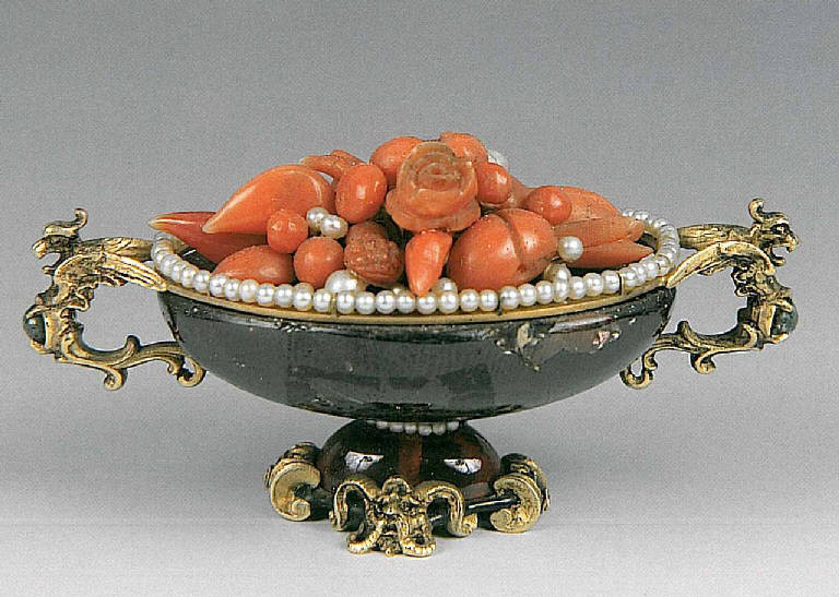 Coppetta in granato con fiori e frutta in corallo e manici d'oro a forma di arpie