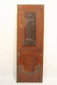 Pannello ligneo costituente un'anta di mobile. Sul recto un bassorilievo raffigurante San Giovanni Battista. Sul verso una scimmia dipinta a olio.