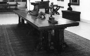 Grande tavolo in legno di noce. Il perimetro del piano è riccamente scolpito. Sostegni laterali con quattro colonnine e due pilastrini scolpiti, così come l'asse con il pilastrino centrale e due colonnine.