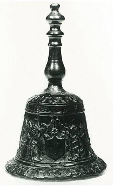 campanello a mano cesellato con manico tornito; decorazioni a girali vegetali e stemma