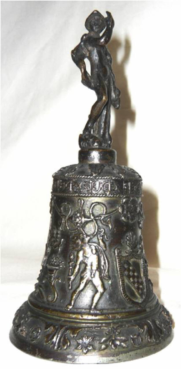 Campanello a mano, cesellato, con statuetta di David per manico. Decorazione a festoni intrecciati e trofei, un amorino su biga, baccante (?) e stemma.