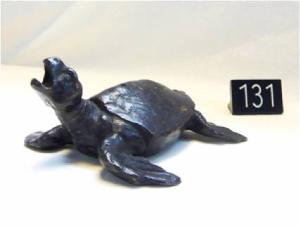 Scultura di tartaruga marina con becco aperto rivolto verso l'alto.