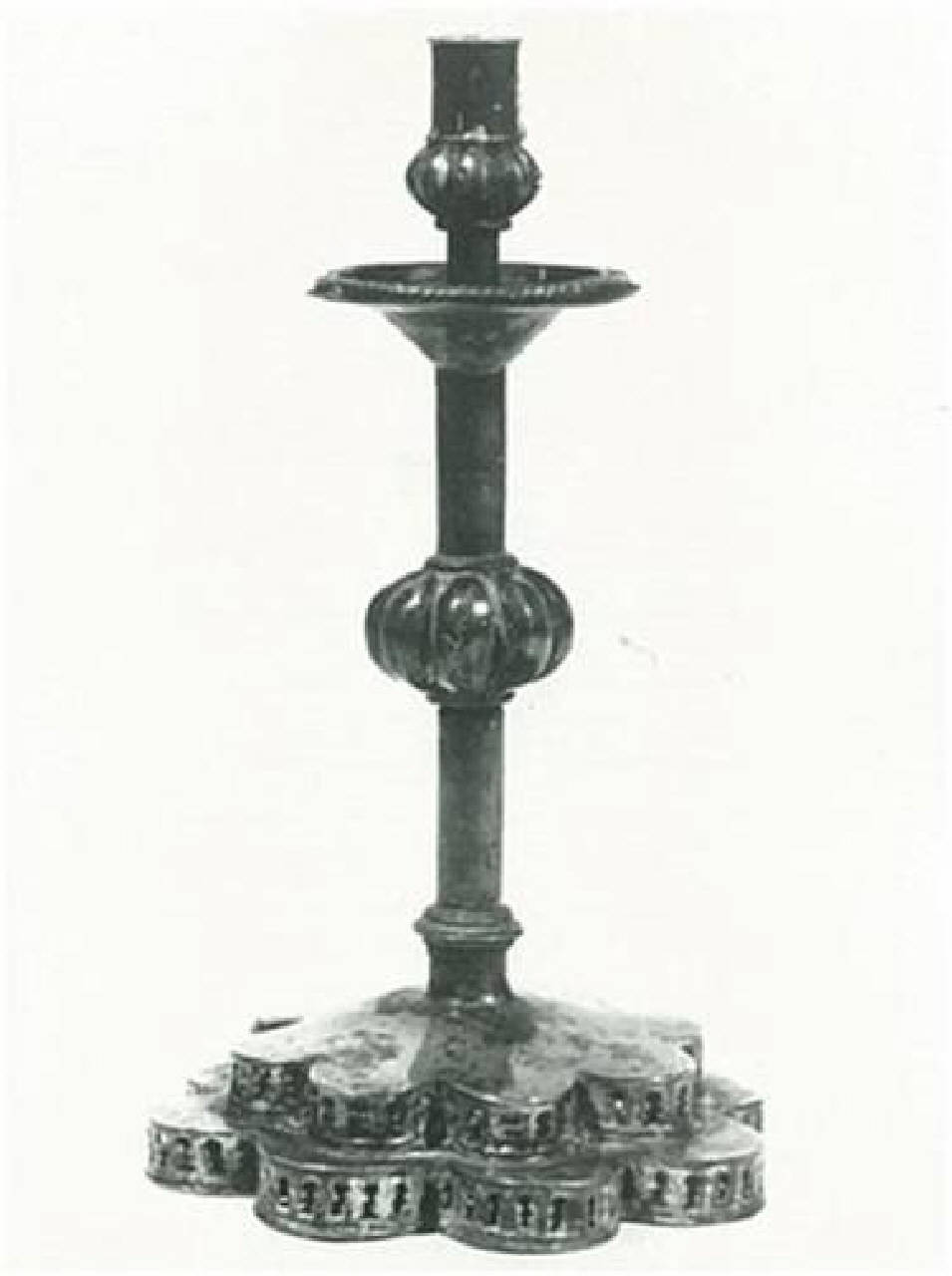 Candeliere dalla base formata da due elementi sovrapposti a forma di fiori a otto lobi. Il fusto liscio è composto da un nodo esalobato. Copia eseguita nell'Ottocento sulla base del piedistallo in oro della "crocetta del Tesoro di San Marco".