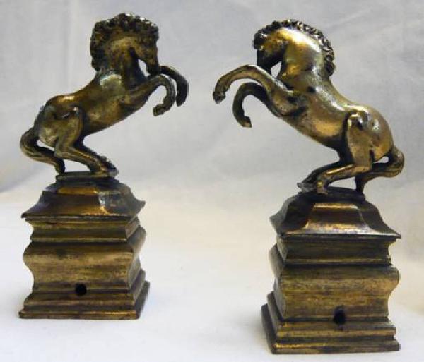 Coppia di cavalli impennati in bronzo dorato; base cubica con modanatura.