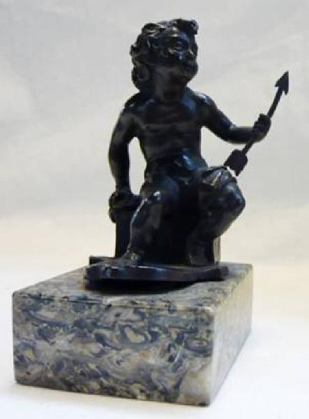 statuetta di Cupido seduto con freccia nella mano sinistra