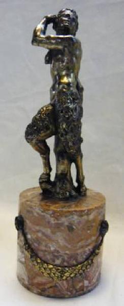 scultura di faunessa in bronzo dorato sopra base cilindrica in marmo, con festone in bronzo dorato