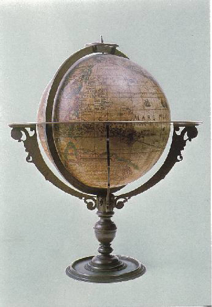 Sfera terrestre con raffigurazioni di continenti e mari su carta stampata a colori; montatura in rame e bronzo; piede tornito. Reca una scritta e la marca di fabbrica