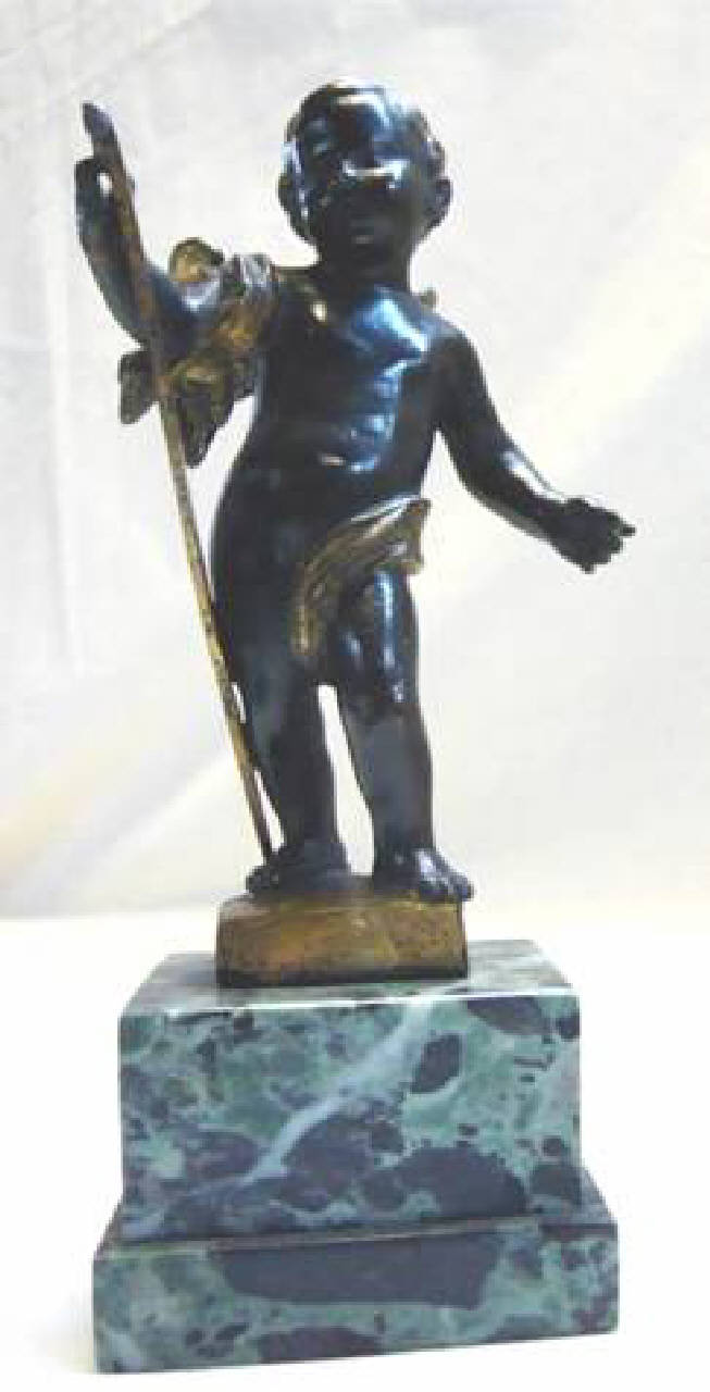 Putto in bronzo con ali dorate reggente un'asta.
