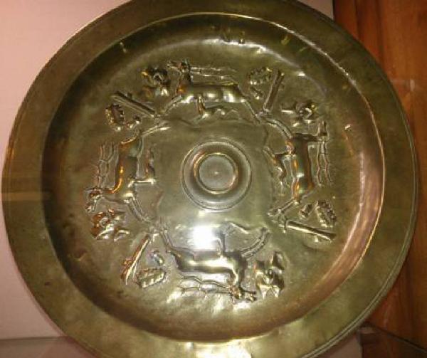 bacile in ottone brunito. Decorato con quattro coppie di cervi alternati a ceppi di quercia.