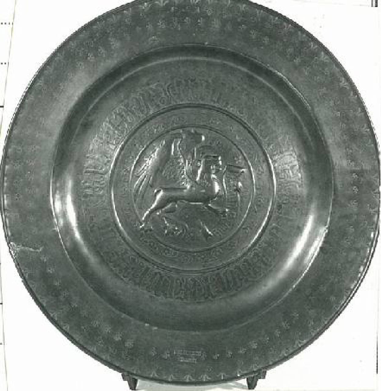 bacile in ottone. Decorato con un leone alato che stringe fra gli artigli un cartiglio.