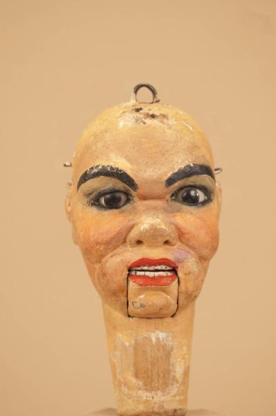 Testa in legno di tiglio, occhi di vetro. Bocca mobile.