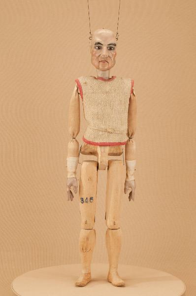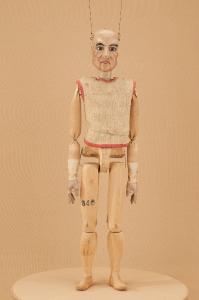 Testa di legno di tiglio fissata al corpo tramite ferro, occhi di vetro, bocca mobile. Corpo grande in tiglio grezzo tagliato in vita e raccordato con anelli e stoffa. Gambe unite al bacino tramite bordione in ferro, ginocchia ad incastro mobile. Mani mobili in tiglio con dita scolpite e separate. Bilancino a croce metodo Holden.