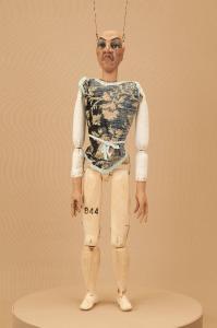 Testa di legno di tiglio fissata al corpo tramite ferro, occhi di vetro. Corpo grande in abete. Gambe unite al bacino tramite bordione in ferro, ginocchia ad incastro mobile. Mani in tiglio con dita scolpite e separate.