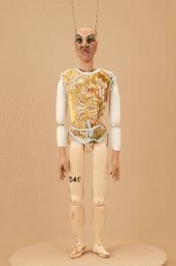 Testa di legno di tiglio fissata al corpo tramite ferro, occhi di vetro. Corpo grande in abete. Gambe unite al bacino tramite bordione in ferro, ginocchia ad incastro mobile. Mani in tiglio con dita scolpite e separate.