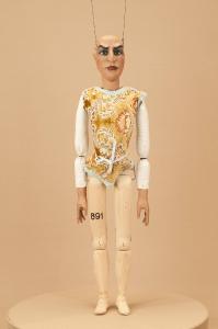 Testa di legno di tiglio fissata al corpo tramite ferro, occhi di vetro. Corpo normale in abete. Gambe unite al bacino tramite bordione in ferro, ginocchia ad incastro mobile. Mani in tiglio con dita scolpite e separate.