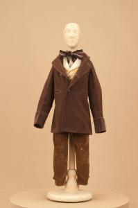 Costume da uomo borghese di foggia ottocentesca composto da pantaloni, redingote, gilet e cravatta.