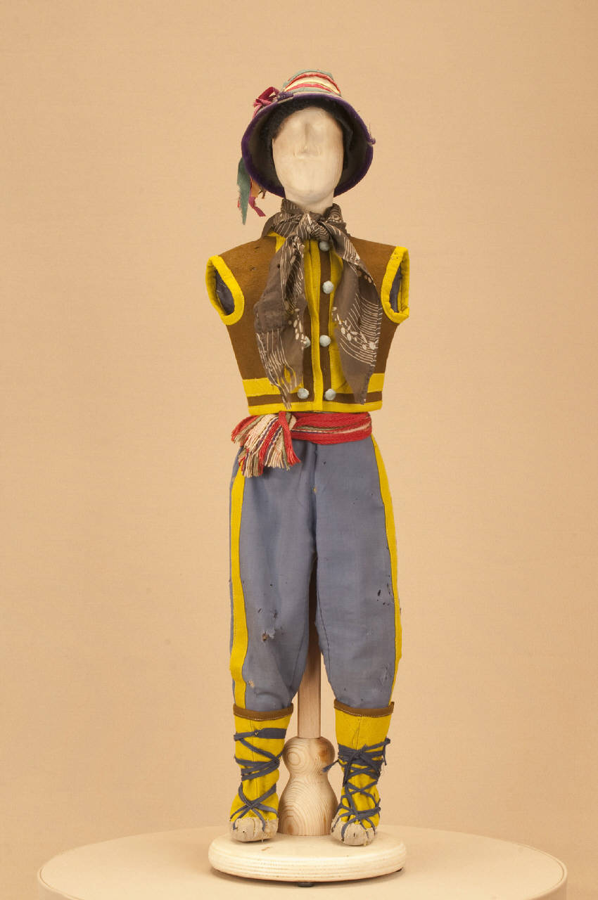 - NOTIZIE STORICO CRITICHE Il costume si completa con camicia. La presenza in questo costume di punti di cucitura eseguiti a macchina testimonia l¿avvenuta confezione presso una sartoria, presumibilmente situata nella città di Parma, luogo in cui fu allestito per la prima volta questo spettacolo, come documenta l¿articolo di giornale citato nella bibliografia.\nGli spettacoli della Compagnia Carlo Colla che trattano il tema del brigantaggio nell¿Italia settentrionale e meridionale, erano in repertorio già dal 1863, come si evince dal libro mastro 1863-1879. I titoli erano "Majno della Spinetta", "I misteri del brigantaggio" e "I briganti della Callabria"(sic). Nel 1904 quest¿ultimo diventa "Caruso e i suoi briganti". Da questo spettacolo traggono origine nel 1907 l¿azione coreografica in 7 quadri "L¿umile eroe" con la musica di Corrado Gualtieri e nel 1918 "L¿asino e il Curato", commedia in due atti, entrambe a firma di Carlo II Colla.\nIl ballo "storico patriottico" "L¿umile eroe" rientra nei progetti di informazione sugli episodi storici che caratterizzarono la seconda metà dell¿800, tema trattato da tutte le compagnie marionettistiche di giro. Ad esso si affiancava l¿indagine sui fenomeni di trasformazione sociale che seguirono l¿età risorgimentale fra cui trova spazio il fenomeno del brigantaggio nell¿Italia settentrionale e meridionale. L¿ultima replica del ballo al Teatro Gerolamo di Milano risale al 1954.