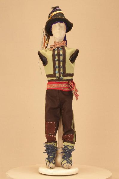 - NOTIZIE STORICO CRITICHE Il costume si completa con camicia. La presenza in questo costume di punti di cucitura eseguiti a macchina testimonia l¿avvenuta confezione presso una sartoria, presumibilmente situata nella città di Parma, luogo in cui fu allestito per la prima volta questo spettacolo, come documenta l¿articolo di giornale citato nella bibliografia.\nGli spettacoli della Compagnia Carlo Colla che trattano il tema del brigantaggio nell¿Italia settentrionale e meridionale, erano in repertorio già dal 1863, come si evince dal libro mastro 1863-1879. I titoli erano "Majno della Spinetta", "I misteri del brigantaggio" e "I briganti della Callabria"(sic). Nel 1904 quest¿ultimo diventa "Caruso e i suoi briganti". Da questo spettacolo traggono origine nel 1907 l¿azione coreografica in 7 quadri "L¿umile eroe" con la musica di Corrado Gualtieri e nel 1918 "L¿asino e il Curato", commedia in due atti, entrambe a firma di Carlo II Colla.\nIl ballo "storico patriottico" "L¿umile eroe" rientra nei progetti di informazione sugli episodi storici che caratterizzarono la seconda metà dell¿800, tema trattato da tutte le compagnie marionettistiche di giro. Ad esso si affiancava l¿indagine sui fenomeni di trasformazione sociale che seguirono l¿età risorgimentale fra cui trova spazio il fenomeno del brigantaggio nell¿Italia settentrionale e meridionale. L¿ultima replica del ballo al Teatro Gerolamo di Milano risale al 1954.