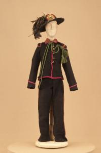 - NOTIZIE STORICO CRITICHE Il costume si completa con collo militare, polsi, ghette e buffetterie.\nGli spettacoli della Compagnia Carlo Colla che trattano il tema del brigantaggio nell¿Italia settentrionale e meridionale, erano in repertorio già dal 1863, come si evince dal libro mastro 1863-1879. I titoli erano "Majno della Spinetta", "I misteri del brigantaggio" e "I briganti della Callabria"(sic). Nel 1904 quest¿ultimo diventa "Caruso e i suoi briganti". Da questo spettacolo traggono origine nel 1907 l¿azione coreografica in 7 quadri "L¿umile eroe" con la musica di Corrado Gualtieri e nel 1918 "L¿asino e il Curato", commedia in due atti, entrambe a firma di Carlo II Colla.\nIl ballo "storico patriottico" "L¿umile eroe" rientra nei progetti di informazione sugli episodi storici che caratterizzarono la seconda metà dell¿800, tema trattato da tutte le compagnie marionettistiche di giro. Ad esso si affiancava l¿indagine sui fenomeni di trasformazione sociale che seguirono l¿età risorgimentale fra cui trova spazio il fenomeno del brigantaggio nell¿Italia settentrionale e meridionale. L¿ultima replica del ballo al Teatro Gerolamo di Milano risale al 1954.