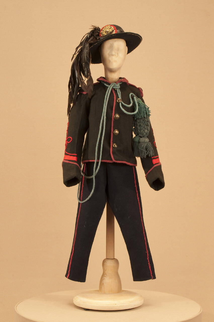 Costume militare da bersagliere composto da pantaloni, giacca, cappello e cordone.