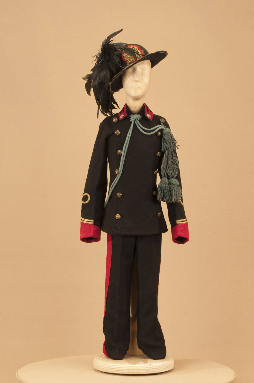 Costume militare da bersagliere composto da pantaloni, giacca, cappello e cordone.