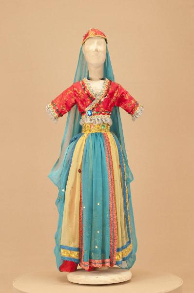 Costume folcloristico da ballerina indiana composto da pantaloni, gonna, bolero, cappello e velo.