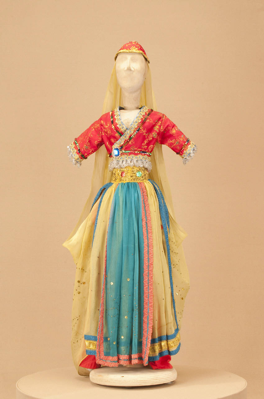 Costume folcloristico da ballerina indiana composto da pantaloni, gonna, bolero, cappello e velo.