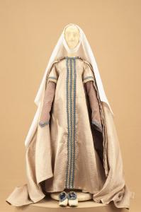 Costume da nobildonna medievale composto da veste, soggolo, mantello, velo e scarpe.