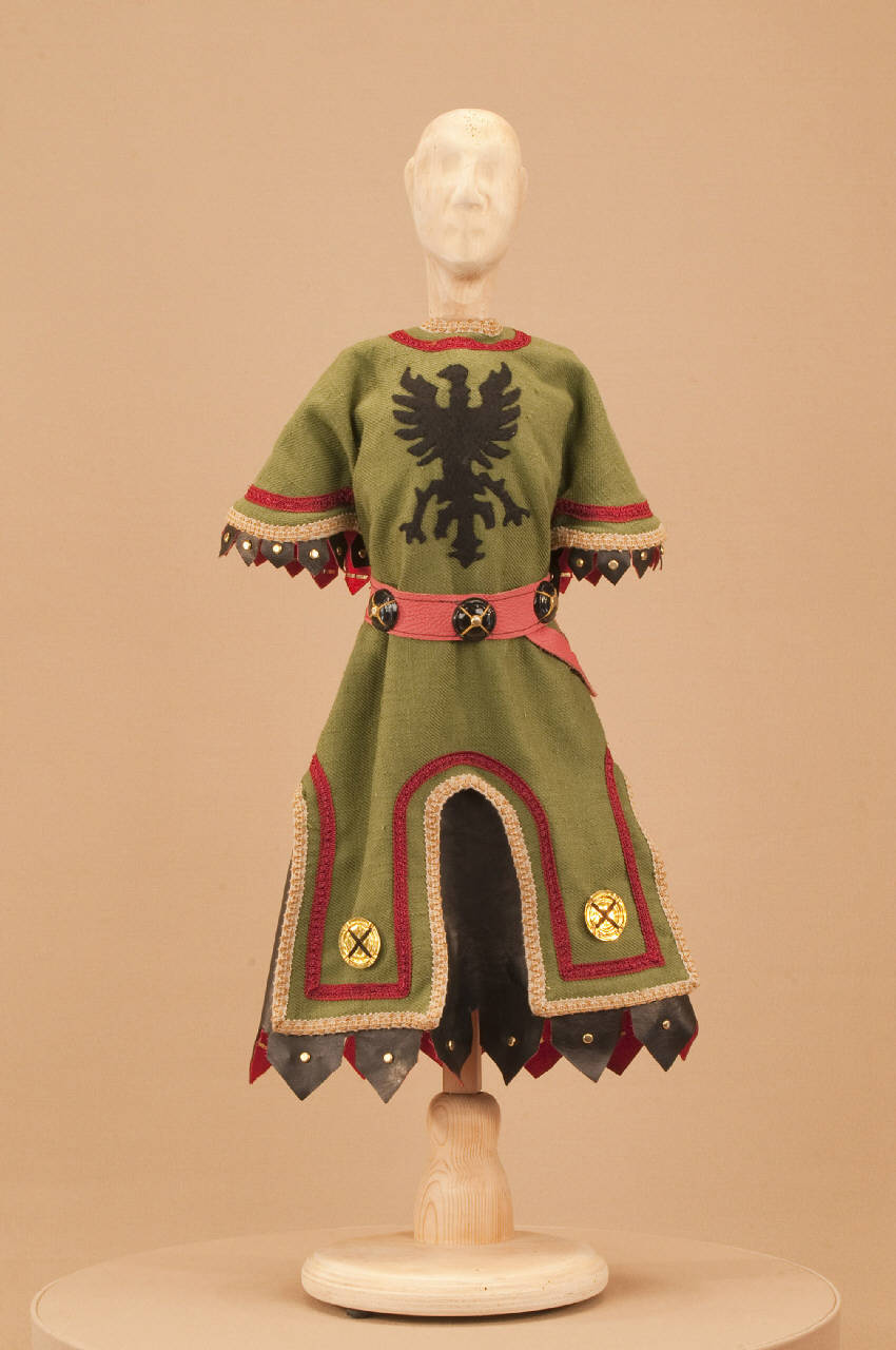- NOTIZIE STORICO CRITICHE Il costume, che si completa con calzamaglia di cotone, con bracciali di pelle, con calze, maniche e cuffia in maglia di ferro, è stato realizzato per "La Battaglia di Legnano", dramma lirico di Salvatore Cammarano con musica di Giuseppe Verdi andato in scena per la prima volta nel 1849 e per l¿apertura della stagione al Teatro alla Scala nel 1961 in occasione delle manifestazioni per celebrare il Centenario dell¿Unità d¿Italia, entra nel repertorio della Compagnia Marionettistica Carlo Colla e Figli nel maggio 1992, commissionata dalla cittadina lombarda in questione in occasione delle celebrazioni dell¿evento storico. Patria, onore, sacrificio di sé, libertà, si mescolano ad una vicenda amorosa di maniera dove, però, appaiono temi che in opere successive troveranno più ampio respiro. Per il riallestimento del 2012 al Piccolo Teatro di Milano, sono stati realizzati nuovi costumi, su ideazione di Eugenio Monti Colla e Cecilia Di Marco, e scene da Franco Citterio. I siparietti utilizzati sono siparietti storici, realizzati da Alessandro Colla nel 1932.