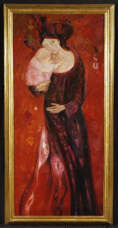 Madre su fondi rossi a Corniglia. Madre e figlio