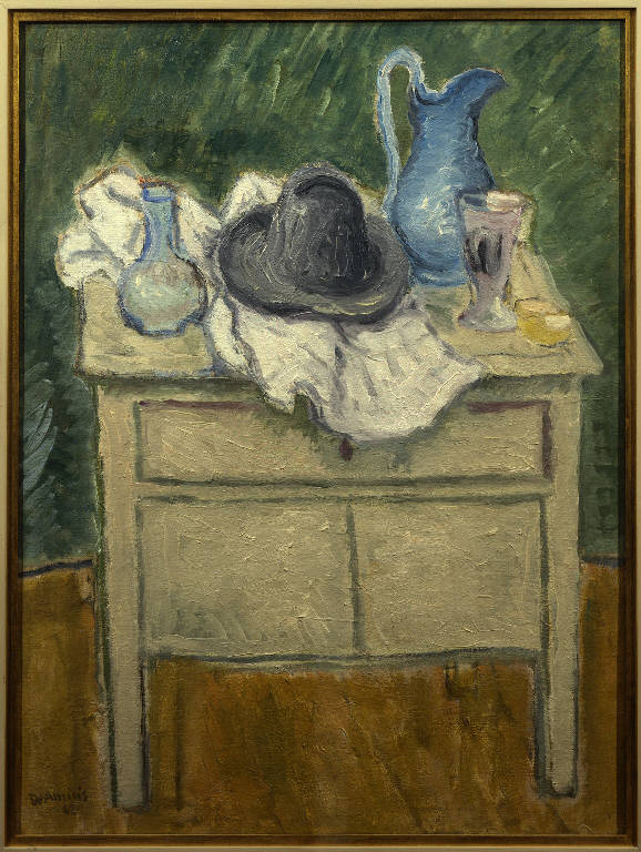 Natura morta con caraffa e cappello su un mobile