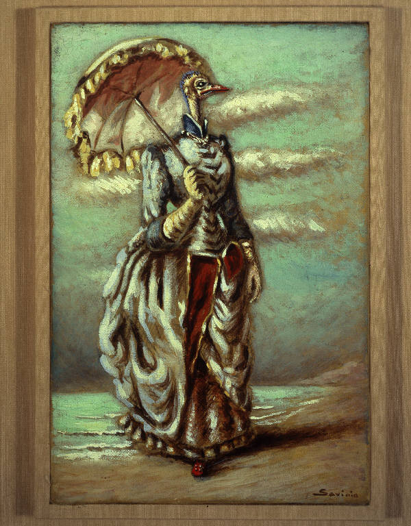 Passeggiatrice in riva al mare. Figura femminile con testa di uccello in riva al mare