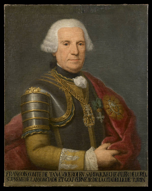 - NOTIZIE STORICO CRITICHE Il ritratto in oggetto raffigura Francesco Tana, conte di Santena, nominato viceré di Sardegna nel 1758 e successivamente comandante della città e della provincia di Torino. Padre di Agostino Tana, letterato e poeta amico di Vittorio Alfieri, Francesco divenne nel 1771 cavaliere del Supremo Ordine della Santissima Annunziata, massima onorificenza della Reale Casa di Savoia, per le sue alte cariche nel regno. Morì nel 1781. Il dipinto è giunto all'Accademia Carrara nel 2011 come donazione di Michel Bugnion di Losanna insieme ad altri sedici ritratti di personaggi di re, regine e dignitari di casa Savoia. In precedenza il collezionista aveva lasciato alla città di Losanna la villa dell'Hermitage e una parte del suo patrimonio per la creazione di una fondazione d'arte e in questa sede si svolse nel 2011 una mostra di capolavori dell'Accademia Carrara, che fu l'occasione per il lascito al museo bergamasco. I personaggi raffigurati nei ritratti sono identificabili talvolta in base a iscrizioni presenti sui dipinti stessi o sul confronto con ritratti dinastici conservati ancor oggi nelle antiche residenze reali di Torino.