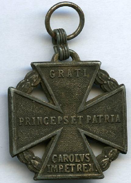 Croce di guerra austriaca (Karl-Truppenkreuz). GRATI / PRINCEPS ET PATRIA / CAROLVS IMP.ET REX; VITAM ET SANGVINEM / MDCCCCXVI