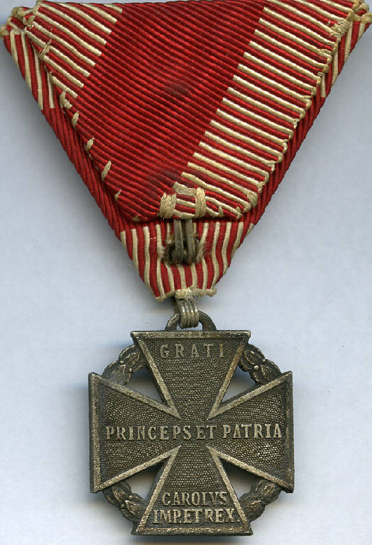Croce di guerra austriaca (Karl-Truppenkreuz). GRATI / PRINCEPS ET PATRIA / CAROLVS IMP.ET REX; VITAM ET SANGVINEM / MDCCCCXVI