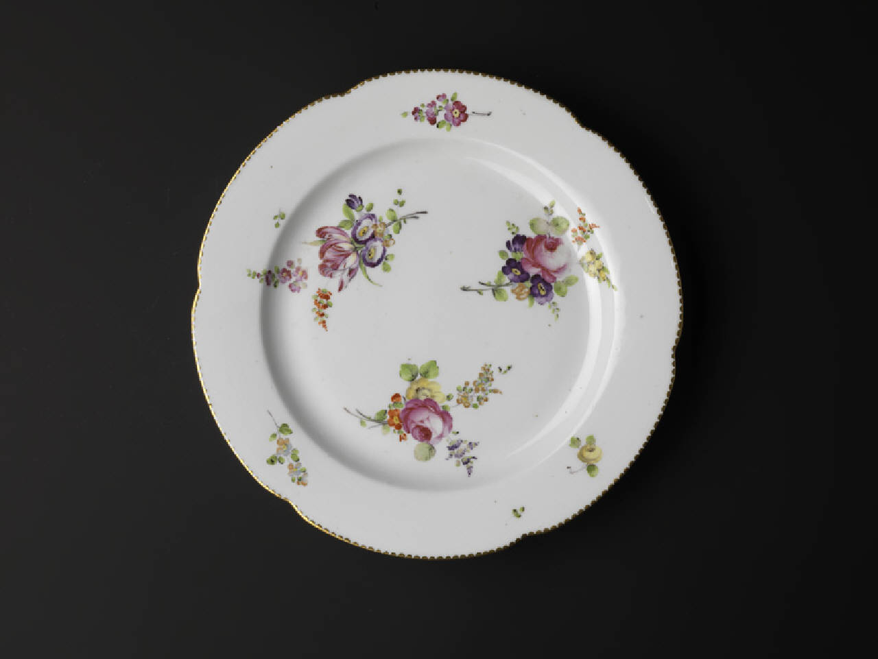 Piatto con orlo leggermente sagomato con orlatura oro, decorazione a dente di lupo, dipinto a mazzetti di fiori "au naturel". I piatti raggruppati in questa scheda, classificati come "Tipo B", sono certamente da ricondurre al servizio acquistato dal conte Tadini.