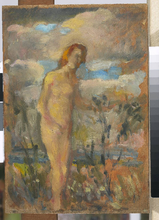 - NOTIZIE STORICO CRITICHE L'artista lascia scoperto il supporto in armonia con i toni aranciati dell'ambiente naturale che avvolge la figura femminile.
