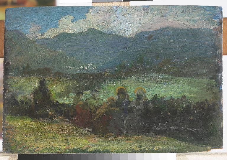- NOTIZIE STORICO CRITICHE Gli scorci montani, cari all'artista e a lungo indagati, costituiscono lo scenario per la rappresentazione di una Sacra Famiglia composta da personaggi che si distinguono appena dall'ambiente naturale.
