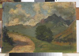 - NOTIZIE STORICO CRITICHE Il bozzetto, privo di titolo che consenta l'identificazione del luogo, ritrae uno scorcio montano realizzato da Antonio Pasinetti nella libertà della pittura all'aria aperta e studiato con maggiore cura nel piano dello sfondo.