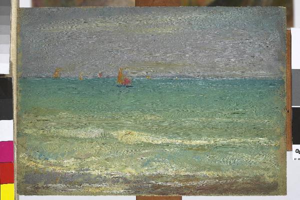 - NOTIZIE STORICO CRITICHE Durante le numerose estati trascorse a Fano, l'artista raffigura il tema balneare, talvolta caratterizzato da bagnanti e cabine, e talora interpretato come nel dipinto in questione come una distesa d'acqua tranquilla e cristallina solcata solo da qualche vela.