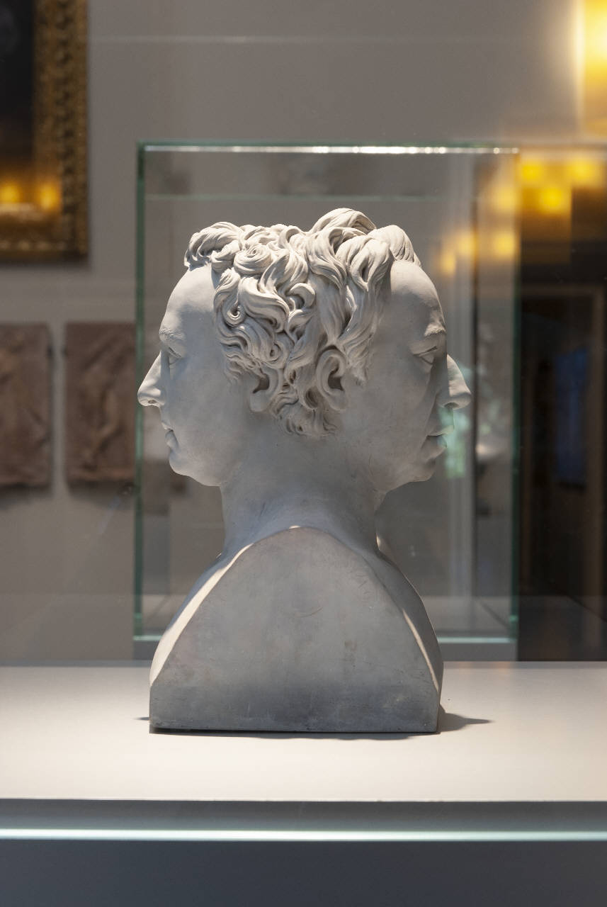 - NOTIZIE STORICO CRITICHE Giovanni Volpato fu un abile incisore di traduzione di origine bassanese, attivo soprattutto a Venezia e a Roma in importanti imprese calcografiche, tra le quali spiccano la "Schola Italicae Picturae" e le celebri tavole tratte dalle Logge di Raffaello. Ben inserito nell'ambiente artistico e antiquario della Roma tardosettecentesca, avviò nel 1786 una brillante attività di riproduzione in biscuit delle più note statue dell'antichità classica per soddisfare alle richieste dei tanti turisti e appassionati giunti a Roma per il Grand Tour. Tale produzione fu fiorente fino al 1800 quando le riproduzioni in biscuit, per le mutate esigenze del mercato, furono sostituite presso la fabbrica di Volpato con stoviglie in terraglia bianca "ad uso d'Inghilterra". La scultura in oggetto, già parte della collezione di scultura dello storico dell'arte Federico Zeri, giunta all'Accademia Carrara nel 2000 dopo la morte del critico, è forse l'unico esemplare conosciuto della manifattura di Volpato non riproducente la statuaria classica ma statue contemporanee. Infatti l'opera combina insieme due busti dello scultore inglese Christofher Heweston, a Roma dal 1771, dedicati rispettivamente al pittore Anton Raphael Mengs (Roma, Pinacoteca Capitolina, 1781) e al suo amico e protettore Josè Nicolàs de Azara, ambasciatore spagnolo a Roma (Parigi, Biblioteca Mazarina, 1775). L'idea della doppia erma deriva da una serie di prototipi antichi, a cominciare dal marmo con "Epicuro e Metrodoro" delle raccolte capitoline. Può darsi che l'erma fosse un dono che Volpato offrì all'amico José Nicolas d'Azara, che lo aveva aiutato nell'avvio della sua manifattura ceramica e che era legato da grande amicizia e stima a Mengs, morto nel 1779: la datazione dell'erma dovrebbe cadere tra il 1786, anno di inizio della produzione Volpato, e il 1796, quando il d'Azara lasciò definitivamente Roma.