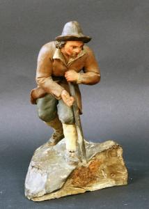 Statuetta in gesso dipinto rappresentante un mendicante con bastone.