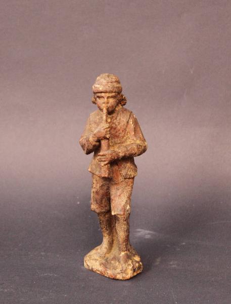 Prototipo in legno rappresentante un pastore intento a suonare il flauto.